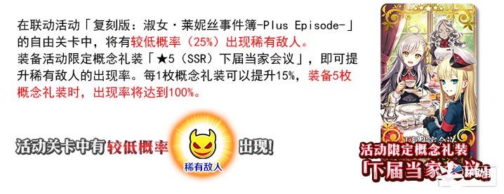 ※本活动为2020年举办过的限时君主·埃尔梅罗Ⅱ世事件簿×Fate/Grand Order联动活动「淑女·莱妮丝事件簿」经过体验优化后的「复刻活动」。