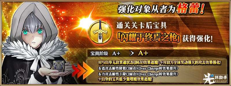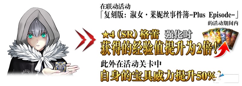 此外,在以下时间段内所有的活动关卡中「★4(SR)格蕾」的宝具威力提升50%!
