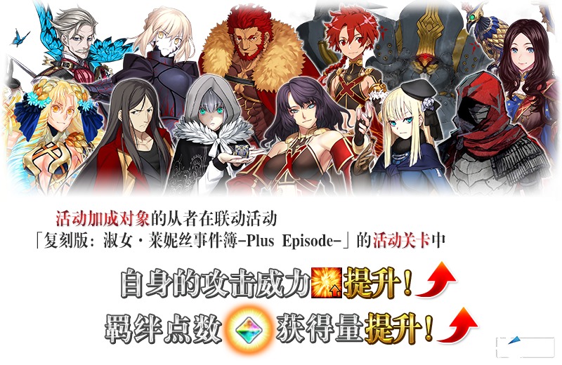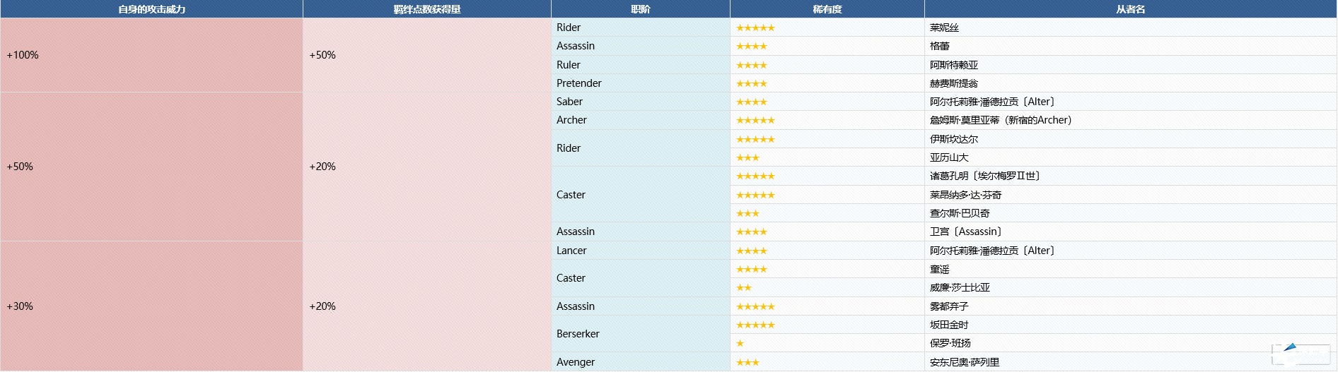 本次活动期间内,下表中的从者将在活动关卡中被付与「自身的攻击威力提升」和「羁绊点数获得量提升」的效果!
