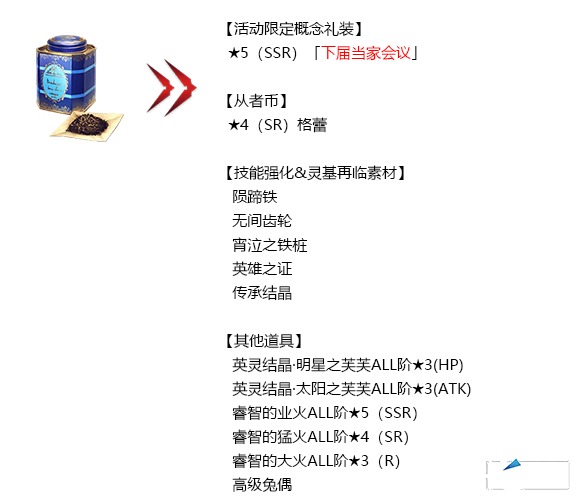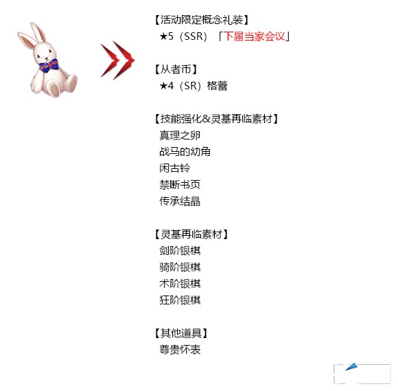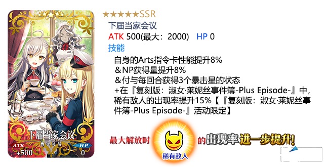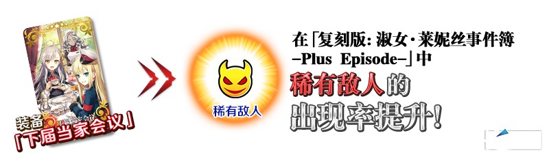 装备通过活动道具交换或任务报酬中获得的活动限定概念礼装「★5(SSR)下届当家会议」,即可提升15%稀有敌人的出现率。