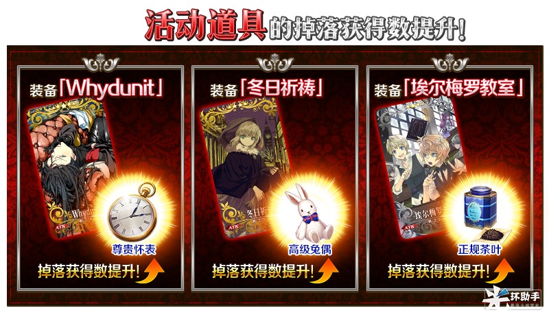 装备在圣晶石召唤中被推荐召唤的限时概念礼装「★5(SSR)Whydunit」、「★4(SR)冬日祈祷」、「★3(R)埃尔梅罗教室」,即可分别提升活动道具「尊贵怀表」、「高级兔偶」、「正规茶叶」的掉落获得数。