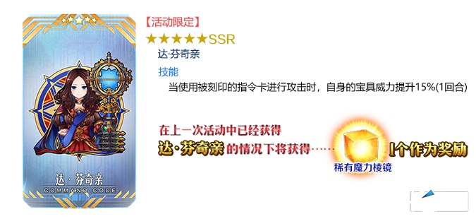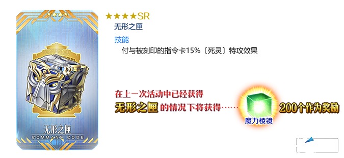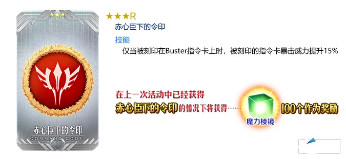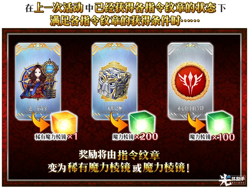 ·在之前的活动中获得活动奖励「指令纹章」的御主,在本次活动的对象任务中将获得稀有魔力棱镜或魔力棱镜作为替代奖励。