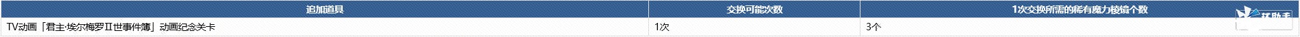 ※「稀有魔力棱镜交换」中追加的『TV动画「君主·埃尔梅罗Ⅱ世事件簿」动画纪念关卡』的关卡开放权为常驻道具,没有交换期限。