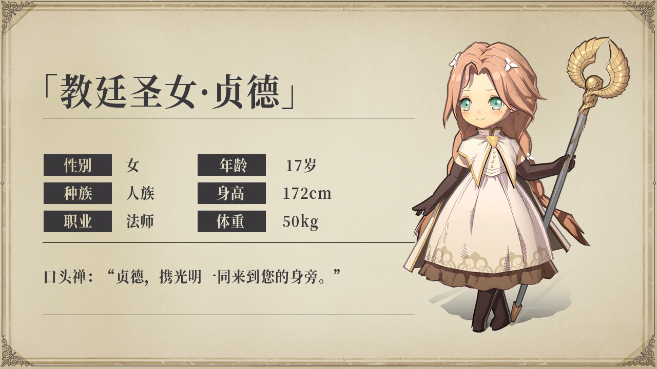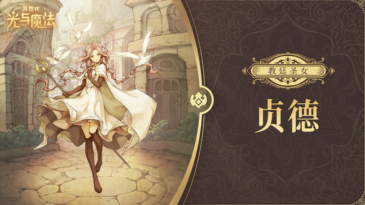 「教廷圣女·贞德」是一位美丽少女,同时也是一位为正义而战的圣女。她手执法杖,喜欢唱歌和祷告,讨厌侵略者和侵略战争。作为正义勇敢的少女,当侵略的战火蔓延到自己国家时,她毅然奔赴战场;作为虔诚的天主教徒,她非常善良,时常救助穷人,送给他们食物,同时禁止对战俘进行杀戮,甚至为一个将要死了的英兵告解……