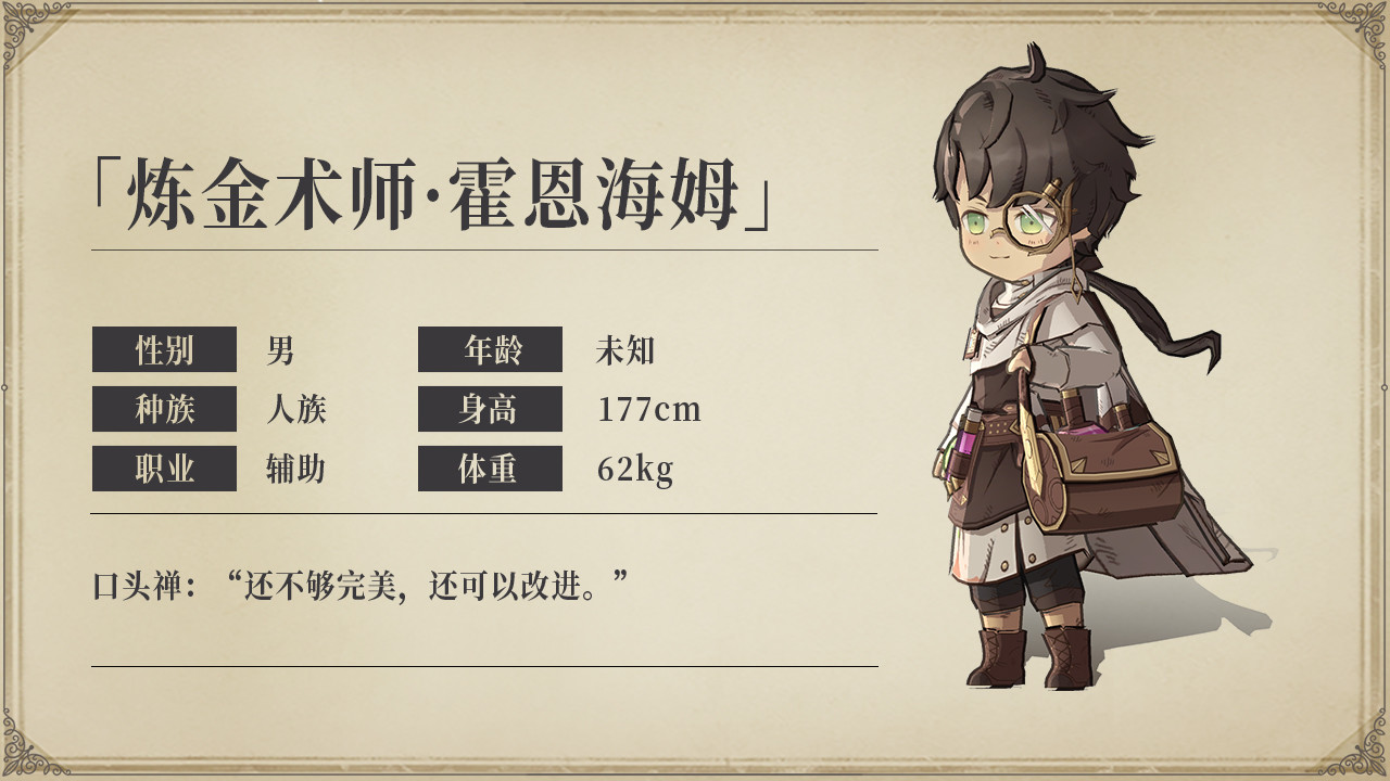 「炼金术师·霍恩海姆」是一名乖僻的天才炼金术师。他时常拿着药剂瓶,喜欢搞研究,坦言干扰他研究的一切因素。他乖僻自傲,我行我素,喜怒不定。