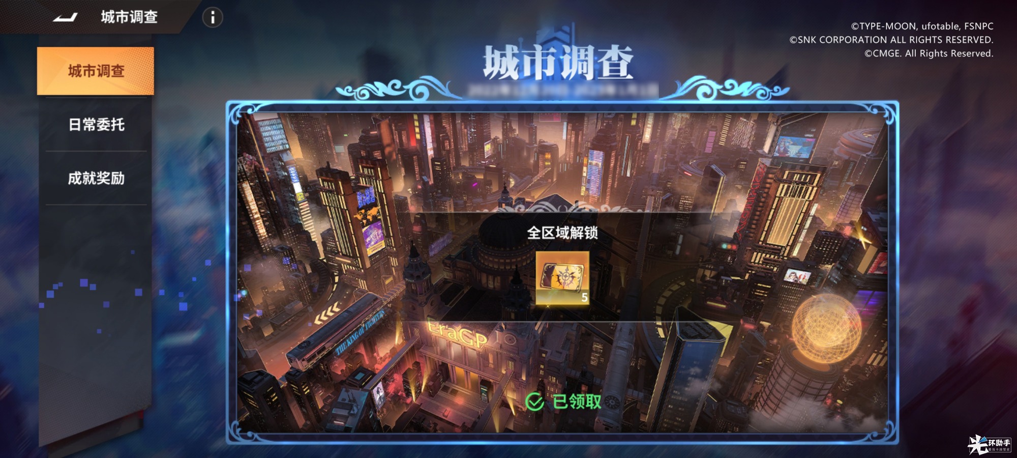 通过完成每日委托,可获取【道具·卫宫邸的钥匙】,用于开启城市调查中未解锁的地区。解锁地区可获得对应奖励,当城市地图被完全解锁后,还可获得【命运通行证】奖励!