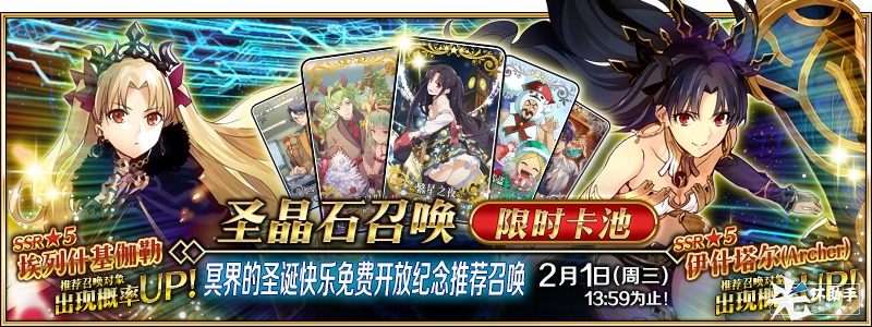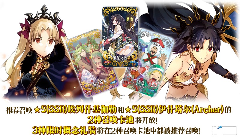为了纪念通关主线关卡第1部 第七特异点后「稀有魔力棱镜交换」中的「主线物语 冥界的圣诞快乐」将免费开放,推荐召唤「★5(SSR)埃列什基伽勒」「★5(SSR)伊什塔尔(Archer)」和2018年的「2018圣诞节推荐召唤(每日替换)」中登场过的3种限时概念礼装的2种召唤卡池将开放!
