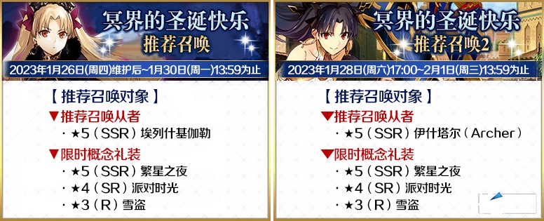 ※「★5(SSR)埃列什基伽勒」和「★5(SSR)伊什塔尔」的推荐召唤卡池为分别的召唤卡池。