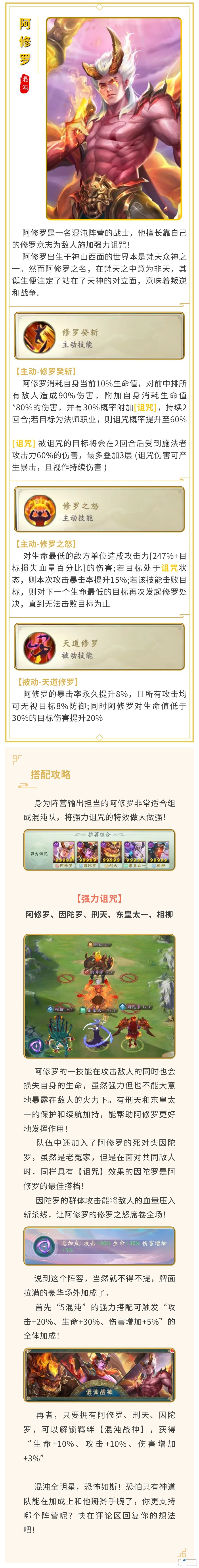 《山海经幻想录》混沌弑神 暴怒修罗!阿修罗攻略伊辛贝露发布于 2023-02-01阿修罗是山海世界西面的梵天神,生性好战易怒,因不满因陀罗的统治,多次对因陀罗发动战争。这样一位弑神者,在山海经幻想录中的玩法如何呢?