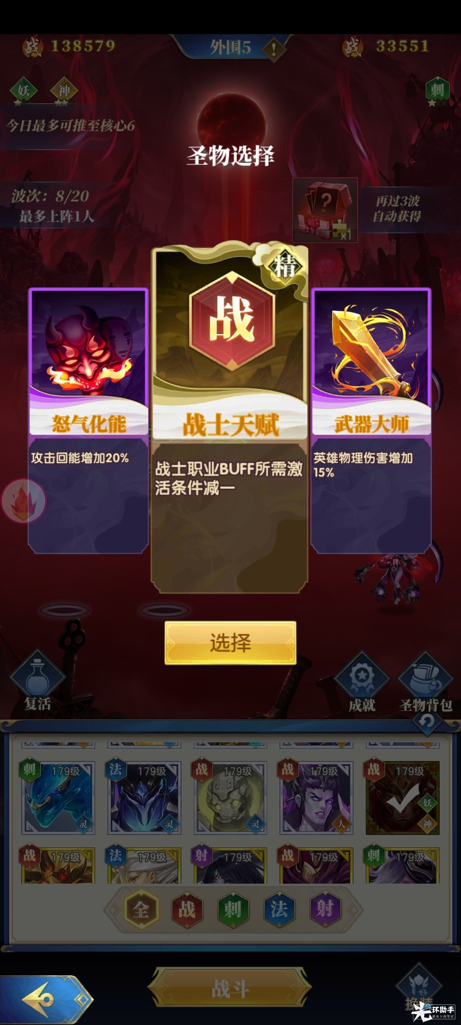 ②圣物选择很重要,根据自己上阵英雄的特点选。难度关卡,圣物优先选加攻击的,然后是开局血量增加、吸血的,最后是减少种族激活条件的。1VS多输出最重要,其次因为关卡的延续性,血量必须保持住。