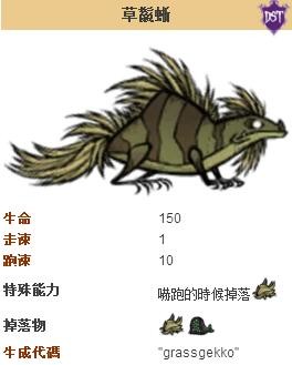 草鬣蜥有1%的机率会在采集干草丛时生成。这个状况只有在附近20个地皮大小范围内都没有草鬣蜥时才会发生。