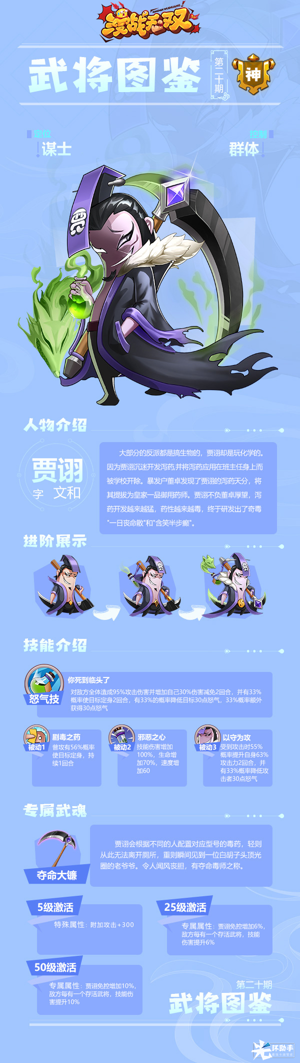 《漫战无双》武将图鉴 第二十期--贾诩白纸扇发布于 2023-02-06武将情报新鲜出炉!本期主人公是三国武将—贾诩 《漫战无双》是一款鬼畜风新三国放置手游,巧妙的将三国经典与现代梗文化相融合,玩出不一样的萌趣三国。