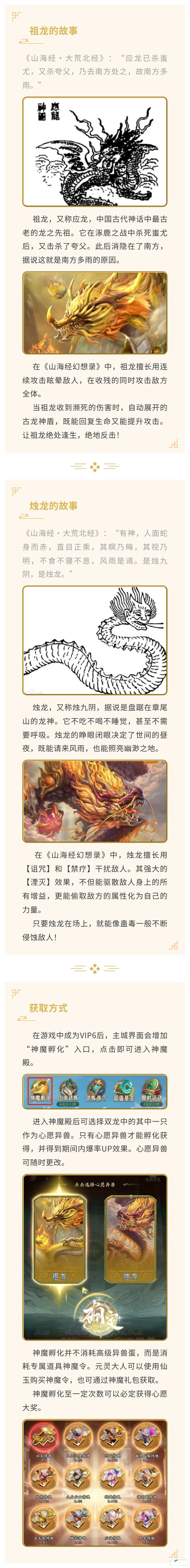 《山海经幻想录》龙吟震天 双龙降世山海!伊辛贝露发布于 2023-02-07话说那涿鹿之战,轩辕黄帝与神农炎帝联手大战魔神蚩尤,然不料这道高一尺魔高一丈。炎黄联军在蚩尤的爪牙阻碍下止步不前。就在这时,天雷滚滚,电闪雷鸣。祖龙和烛龙从云雾中现身,为战局带去了新的变化!双龙背后有着什么样的故事呢?且听玉兔我道来~祖龙和烛龙,你最想要哪只呢?