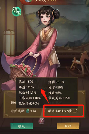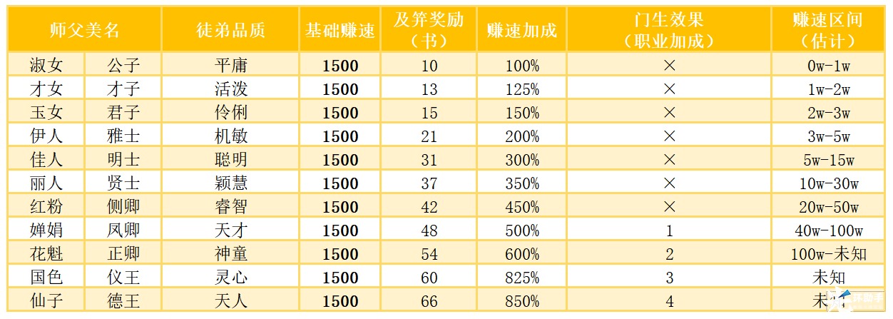 徒弟赚速=品质区间获得数+基础*(品质+师傅+授学+职业+钱庄+门客天赋+挚友美名+孤独终老)+钱庄加成+行善加成