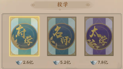徒弟授学有免费、私塾、府学、太学等等,名字不重要主要是分三个等级,徒弟出生在坑位,掌柜可进行选择,三个等级(加成效果30%/40%/50%)越是高品质徒弟越要用好的培养。