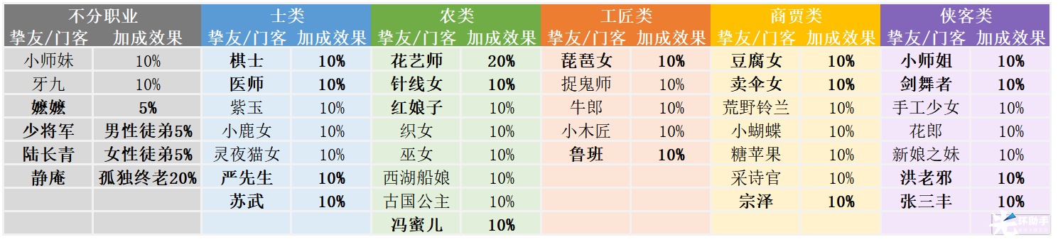 徒弟的职业也会获得加成,主要是门客、挚友相关的加成,这里给大家总结的都是初始挚友、门客(不晋升、精进)的情况,升级后的情况大家可以自己想要的调整。