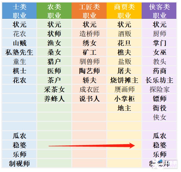 其中加黑字体是免费挚友/门客,可以看出,相对来说,农类徒弟是免费挚友门客初始加成最多的,但是,徒弟职业和挚友的职业并不是固定的,也就是农类挚友可能产出侠客类的徒弟,这里大家做到心中有数就好,是没有办法强求徒弟的品类的。