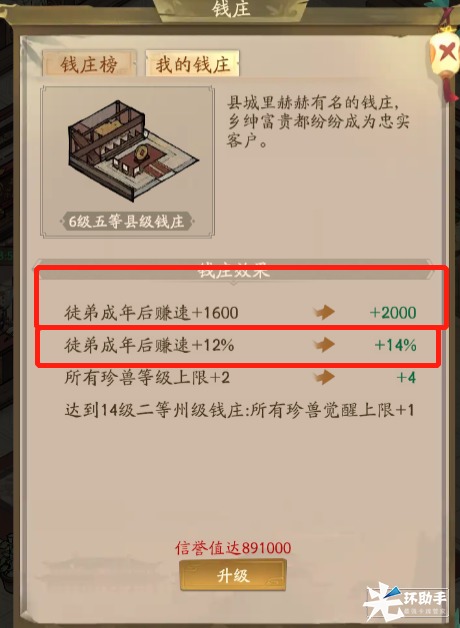 钱庄内部等级也与徒弟的赚速息息相关,信誉值越高,钱庄等级也就会越高,对徒弟成年后的赚速加成也就会越多,而钱庄的信誉值获得主要还是跟我们的柜台数量相关,开的越多,信誉值越高。(当然时间也可以战胜一切)