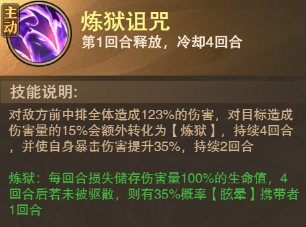 炼狱诅咒是蚩尤唯一的群体攻击手段,附带控制,中规中矩的技能,亮点就是有两回合的爆伤加成。