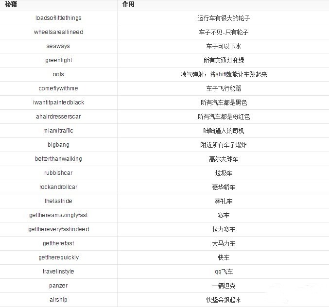 另外作为一个高自由度的游戏来说,就算不完成任务也不会影响到玩家游戏。于是这时候玩家想要什么交通工具在城市中狂飙,或者出现一些奇葩的画面都可以通过这些秘籍来完成。