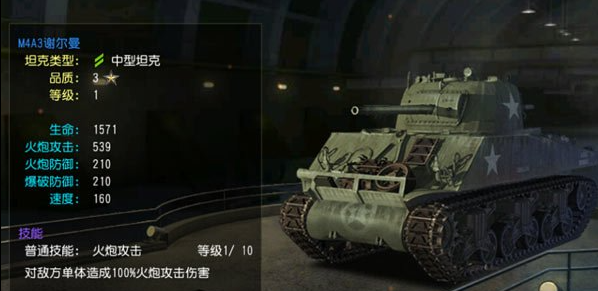 开炮吧坦克M4A3谢尔曼坦克属性介绍白纸扇发布于 2023-02-16开炮吧坦克M4A3谢尔曼坦克属性介绍,在《开炮吧坦克》游戏中,各种活跃在一战、二战中的坦克竞相出现,它们代表了一段历史,代表了人类纷争的历史,代表了时代进步的历史。了解这些战车可以让我们在游戏中更灵活各类战车做出各种各样的战术搭配,下面我们就来看看M4A3谢尔曼坦克的属性吧! 坦克名称:M4A3谢尔曼 坦克类型:中型坦克 品质:3☆☆☆ 等级:1 坦克属性介绍: 生命:1571 火炮攻击:539 火炮防御:210 爆破防御:210 速度:160