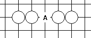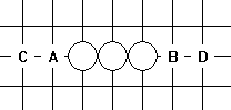 图中,A、B两个点就是必落点,而C和D就是非必落点。为什么是这样呢?下面我解释一下。假如我是白方,我想让黑方落在B上,但是黑方识破了我的意图,于是在A落子以阻挡活三,那么,我还能让黑方把子下在B点吗?相信每个人都能给出答案:当然能——我只要在D处形成冲四,他还是要在B落子,早晚的事。对了,这就是必落点的意思。同理可以证明A点也是必落点。而D就是个非必落点,原因也很简单:如果黑方在A点阻挡,那么白方于B点冲四,如此的话当然可以使黑方落子于D;问题是,如果黑方在B点挡活三,白方就没办法逼黑方把棋下在D点了。这样,有了具体的例子,相信大家就能很容易地理解必落点和非必落点两个概念。