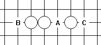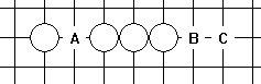 这种跳冲四与其他几种冲四有一点不同:1,3型跳冲四被阻挡后,仍然有再冲一次四的机会。所以,它需要讨论的点就要多一些。图中的A、B、C三个点都是必落点:A是一定要堵的;堵了A之后,白方如果想让黑方落在B点,就在C冲四,如果想让黑方落在C点,就在B冲四——由此就证明了A、B、C三个点都是必落点。不过有一个问题:虽然B、C两点都是必落点,但你却无法让黑方在这两个点上都落子,也就是说你只能选择一个。