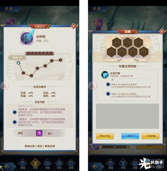 共工的法宝也不同于另外两位战士系的神魔英雄,共工的法宝更为注重增加共工整体的生存能力,最高可以获得一个相当于敌方最高攻击力1000%数值的护盾,虽然护盾数值不能超过自身两倍的血量,但是相对来说也已经可以极大程度的提高自身的生存能力了,法则效果则是有着不俗得到辅助能力,其效果为当法宝的护盾破碎后,可以为全队回复最高80点的能量,等于可以强行进行一波大招的启动,功能不可谓不强。