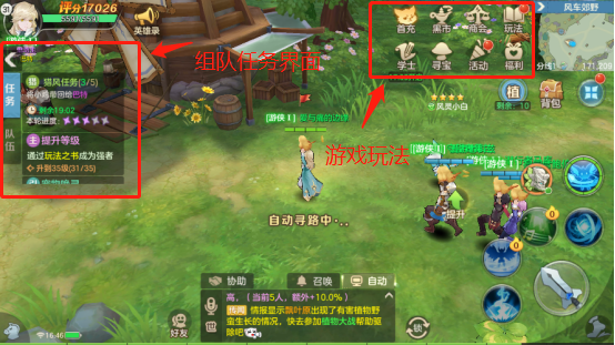 游戏的最左侧是任务和组队选项。可以很直观的显示当前任务和组队情况。