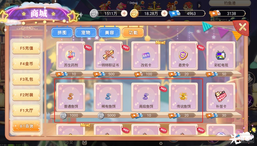 别担心,点击商城—B1百货—功能一栏,就可以购买啦~四种鱼饵随你挑选哦~淘淘乐以及任务完成礼包也会掉落。