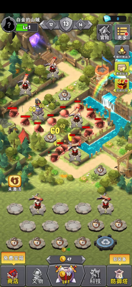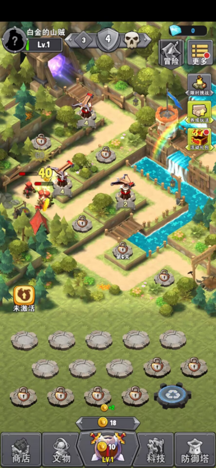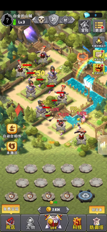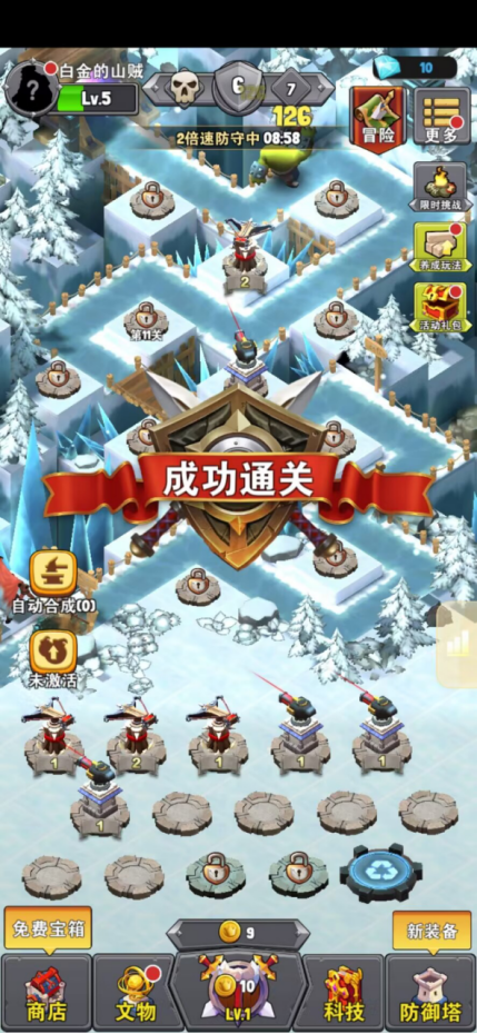 游戏的整体流程还是比较简单一些的,而且在闯关的节奏上还是比较快速,至少在前期并不会感受到枯燥的感觉,再者就是游戏的画面渲染,不管是在塔防设计还是场景地图,能感受到塔防玩法下不同场景的转换,这一点还是蛮有意思的,在游戏的过程中,也会有到一些buff加成的技能提升,例如可以通过道具提升攻击时的射速及伤害,当然了这个过程中攻击塔的等级还是很重要的,最不可少的一个环节就是不断的击杀小怪获得金币,合成更高等级的攻击塔,在游戏中也是感觉到了攻击塔种类的解锁过程还是有些缓慢一些,也算是游戏的局限性吧。