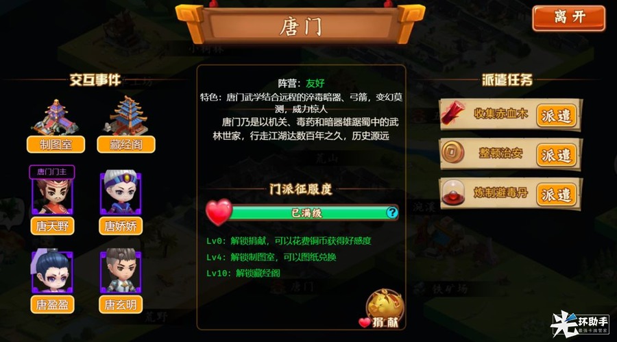 唐门:收集赤血木(3次/天)、整顿治安、炼制避毒丹(3次/天)