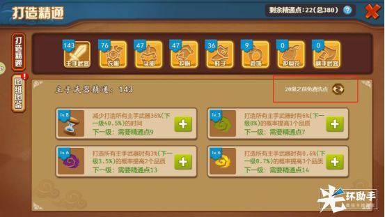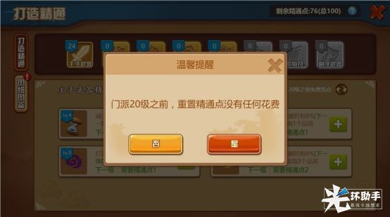 3.20级及以前则有3次的免费重置次数。之后再重置,就会根据已使用的精通点数,等值的花费银元宝重置精通点。