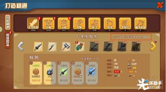 神兵图鉴--图纸图鉴中会显示每种装备的打造熟练度,每次激活装备升级都需要使用一定的熟练度,以及其他相关道具,激活后的装备则在属性上有所加强。
