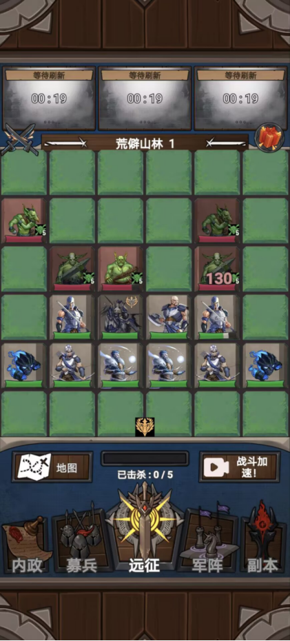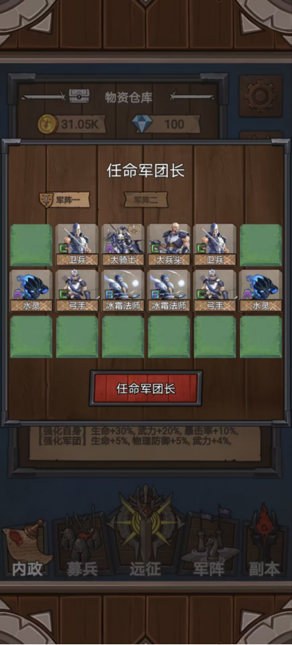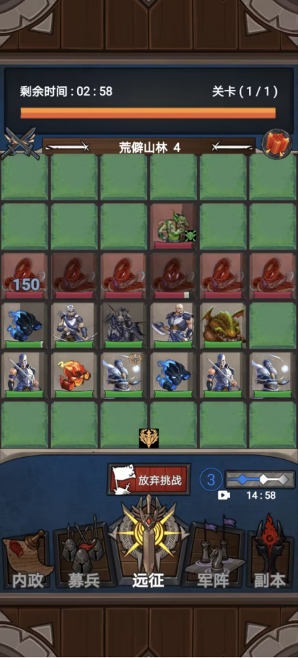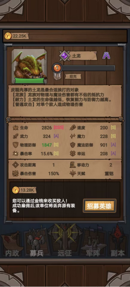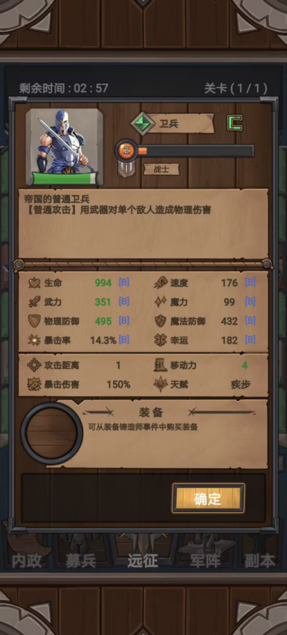 游戏的主界面中有着内政、募兵、远征、军阵、副本等等设计,其中用的最多的就是远征,因为我们要率领武士军团攻城拔寨,在募兵中我们可以通过金币去选择一些战士法师,在军阵中我们可以通过布置军队来提升实力,在个人体验过程中,发现游戏中的武士法师的等级提升并不是以金币为核心的,而是战斗的实际过程,可以快速的提升等级,玩家也是在可以在关卡的过程中,可以点击武士的造型就能很直接的看到它的一些详细数值,例如攻击、速度、生命、天赋等等,就这一点来说,游戏的内容还是比较丰富的哦。