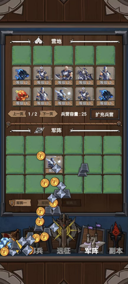游戏的开局还是浓厚的欧洲中世纪造型画面,尤其是在造型设计上,简直很有武士形象,而最有趣的则是本作的UI界面设计,游戏的关卡和道具等等,都是在这么一个界面上呈现的,在给到玩家在直观感受上还是比较清晰明了的,而玩家在其中需要做的就是去排兵布阵,通过手中拥有的武士法师,进行战棋的排列,而这些武士法师则是需要玩家去进行招募,而在战棋的排列过程中,就个人体验来说,目前还没设计到攻击站位等问题,但是在一些职业的布置上可能就需要考虑一下啦。