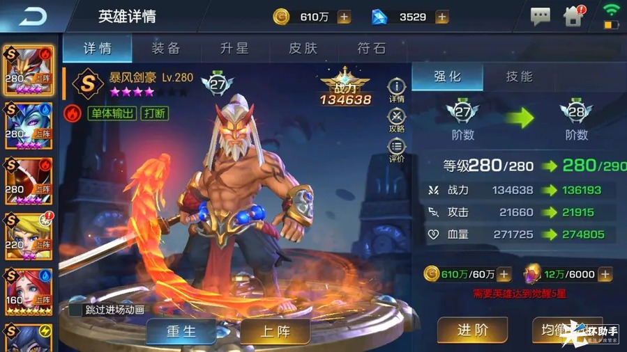 如英雄品阶觉醒到3星,可以额外解锁一个强劲技能;