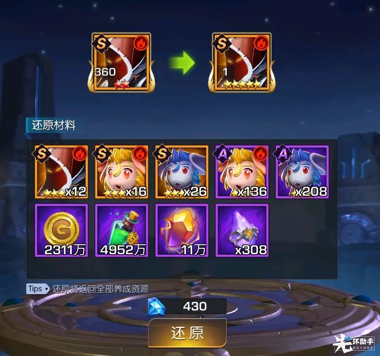 还原——会返回全部养成资源~1.对升星后的英雄进行还原可以将英雄还原为初始星级英雄,返还全部养成材料并自动卸下装备和符石;