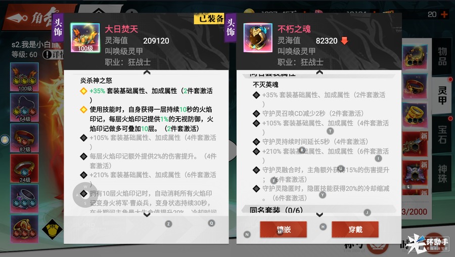今天先来说说灵甲,灵甲由6件散件部位+6件套装部位组成,散件的作用和套装的作用完全不同。穿戴在角色右边的就是6件散件,穿戴在角色左边的就是套装了。