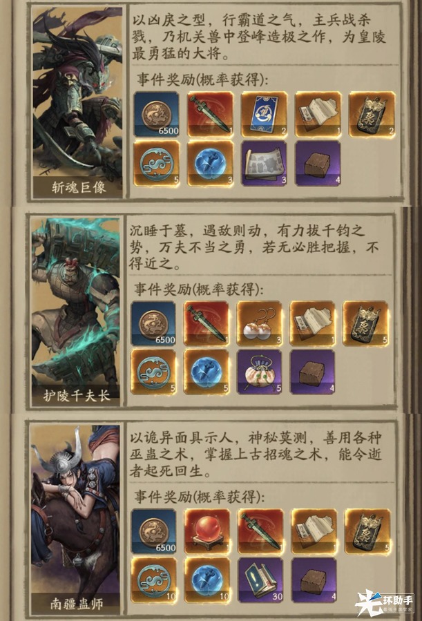 一、探索地图点出的怪的奖励不同,个人需求不同,目标怪的方向也不同。目前情况,多数玩家的目标是占地3*3的战魂巨像、护陵千夫长、南疆蛊师(奖励如下图)。