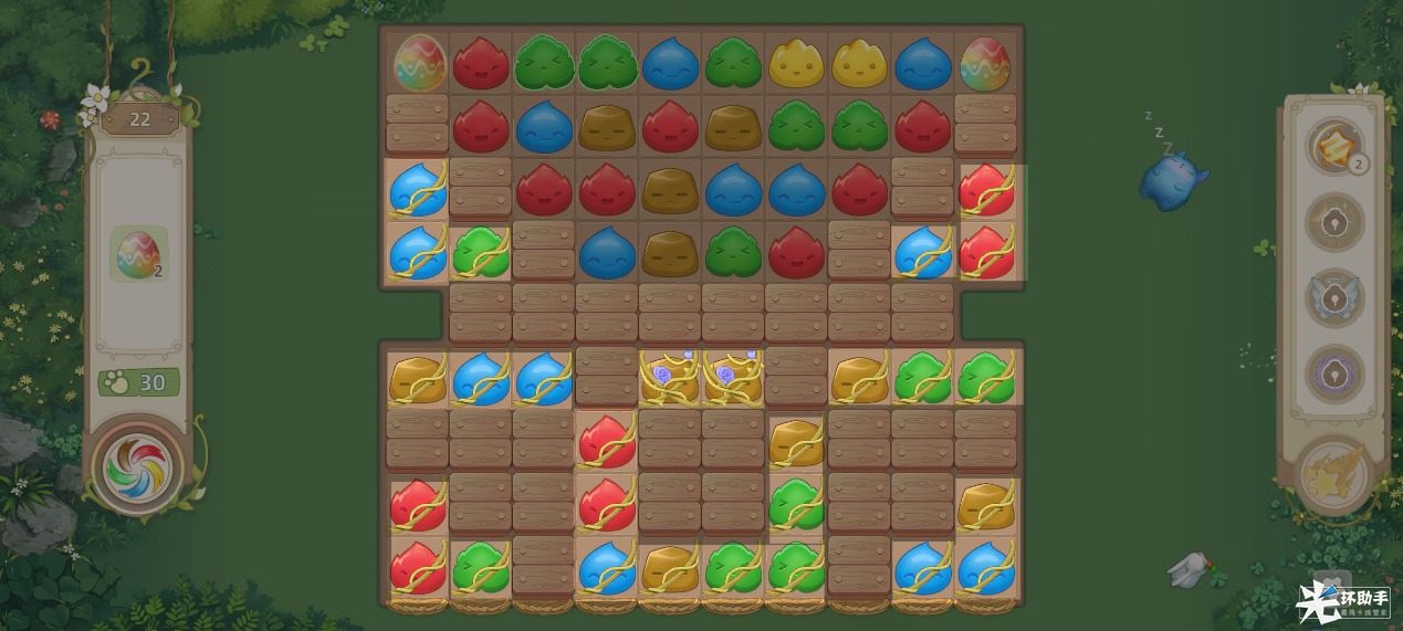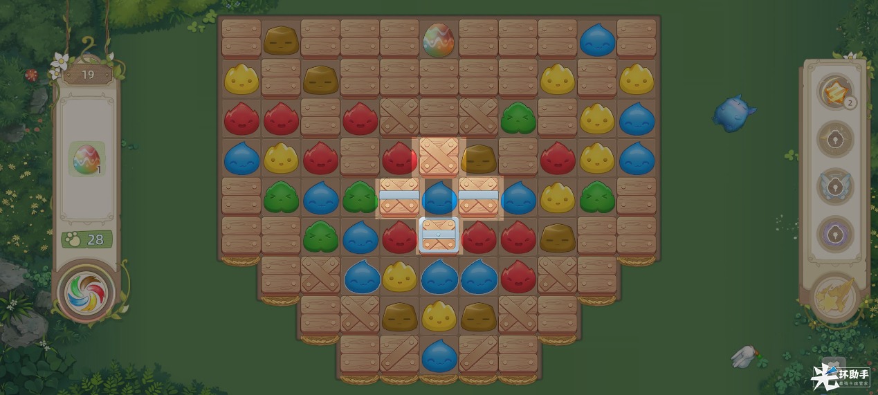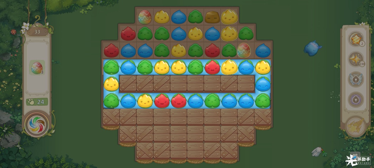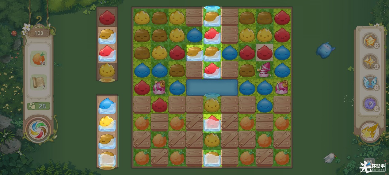 【小溪上飘着的叶子】属于会动的机关,那当然可算的上是障碍物啦,主要表现在元素落在叶子上就会随着小溪顺时针移动,玩家每完成一次消除机关就会移动一格,究竟是云朵人们机关算尽深思远虑,还是被机关算尽却意外消除呢?