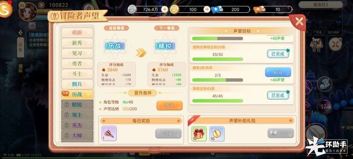 下一等级就是新秀,晋升到新秀评分加成生命就会+480,这个等级的声望目标也是比较简单根据流程就能轻松完成,只有宝石总等级达到3级,这个需要友友去做副本任务或者金币兑换到一定量的宝石进行升级。