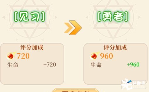 下一等级称号就是勇者啦,评分生命加成就会从720变成960,这个等级的声望目标就比较难了,主要就是怪物大厦挑战,你需要提升自己的实力然后去挑战到20层,所以拼实力的时候到啦!但是,听说对于冒险家来说:小小挑战会更有动力!