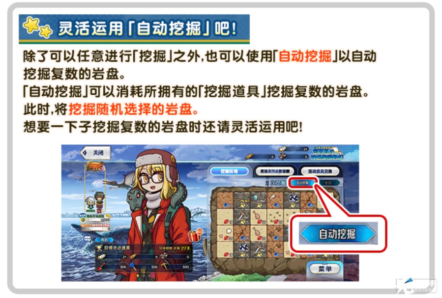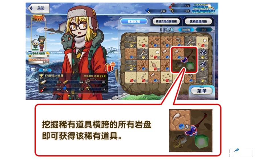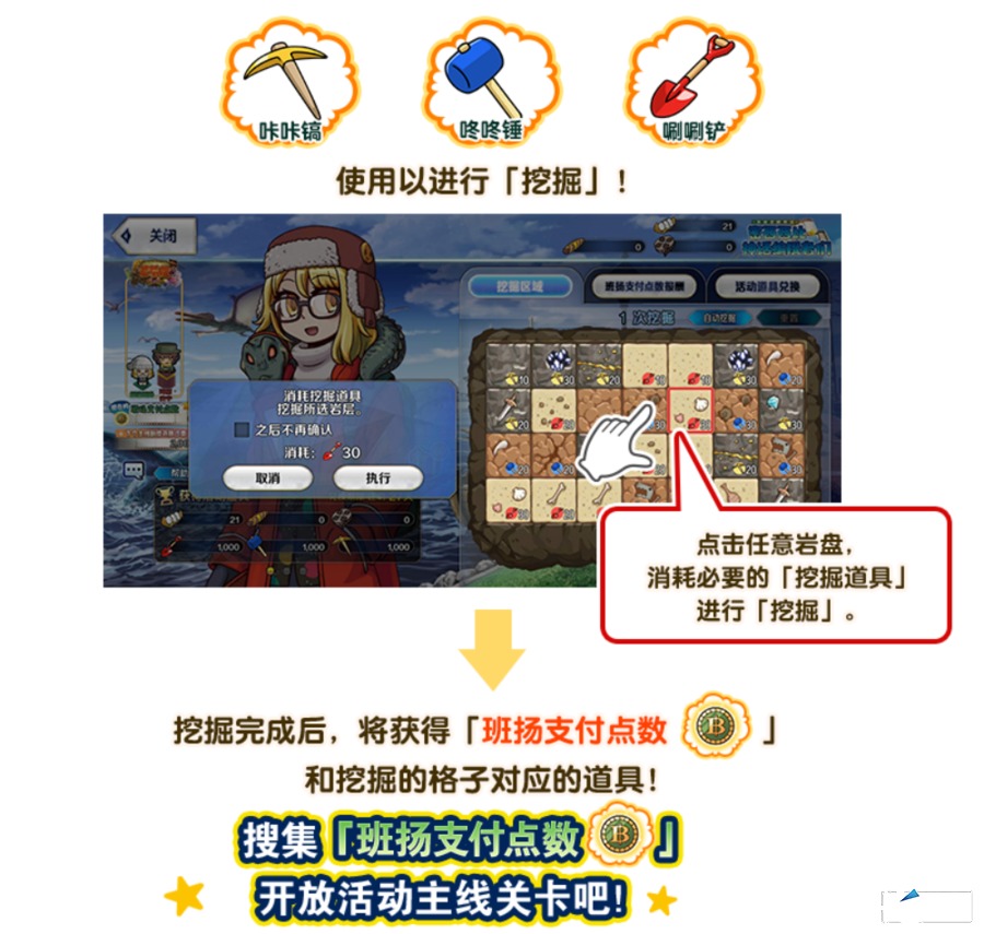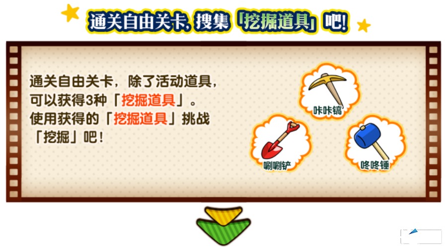 消耗在自由关卡可以获得的「挖掘道具」(唰唰铲、咚咚锤、咔咔镐)即可在活动报酬界面进行「挖掘」。