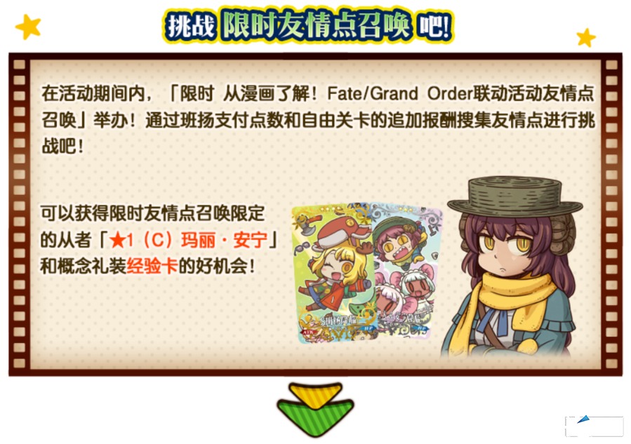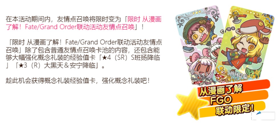 ※在「限时 从漫画了解!Fate/Grand Order联动活动友情点召唤」的时间结束后,无法在普通友情点召唤中获得,敬请注意。