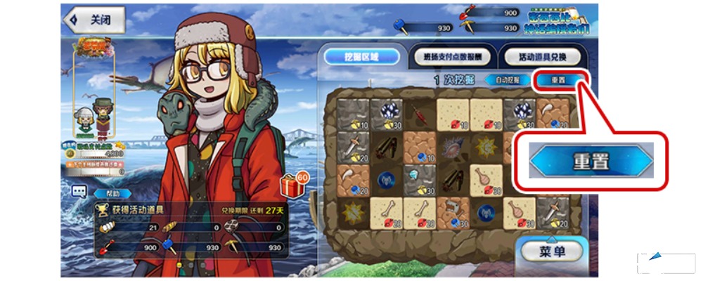 ※在挖掘区域还留有剩余岩盘的情况下进行重置时,无法获得剩余道具,敬请注意。
