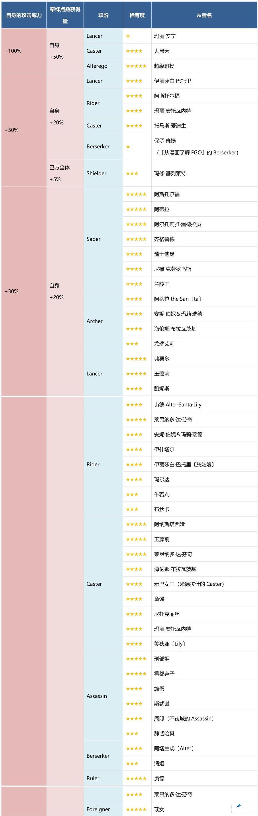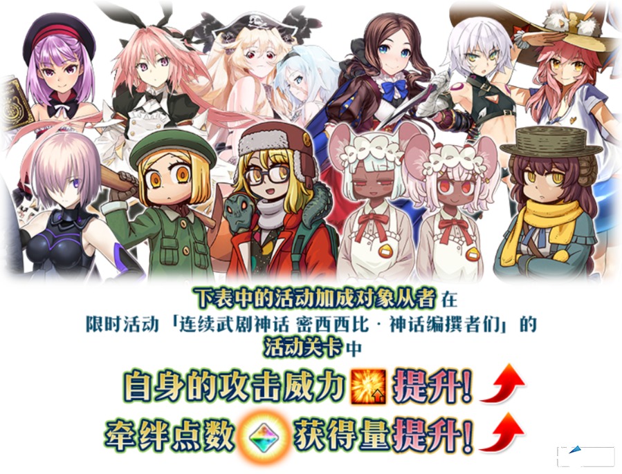 本次活动期间内,下表中的从者将在活动关卡中被付与「自身的攻击威力提升」以及「牵绊点数获得量提升」的效果!