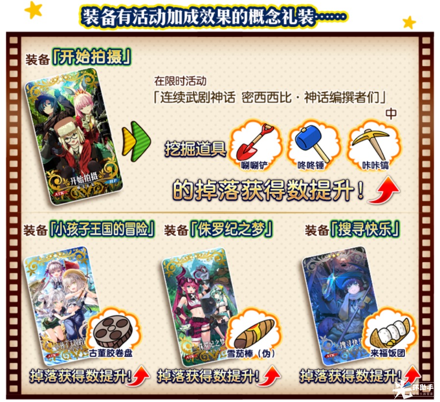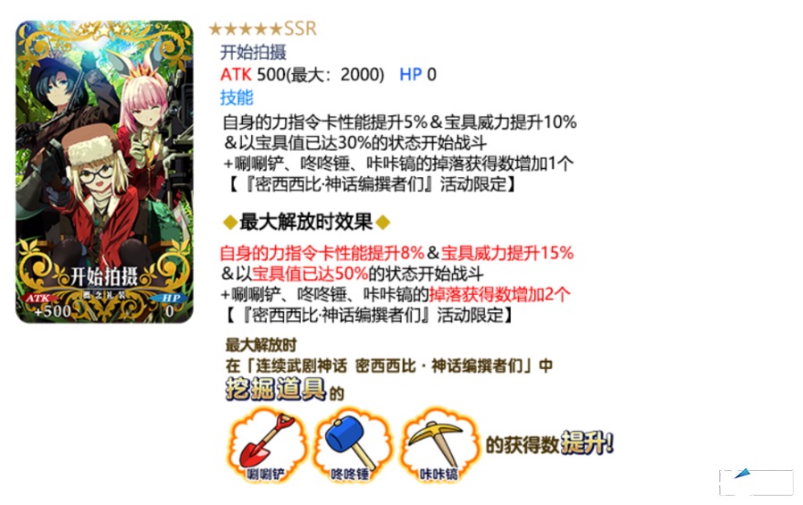 装备活动道具交换中可获得的活动限定概念礼装「★5(SSR)开始拍摄」,在联动活动「连续武剧神话 密西西比·神话编撰者们」中「挖掘道具」(「唰唰铲」、「咚咚锤」、「咔咔镐」)的掉落获得数提升!