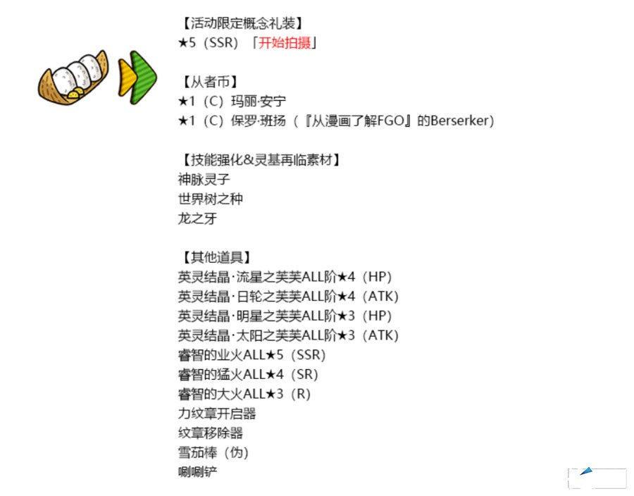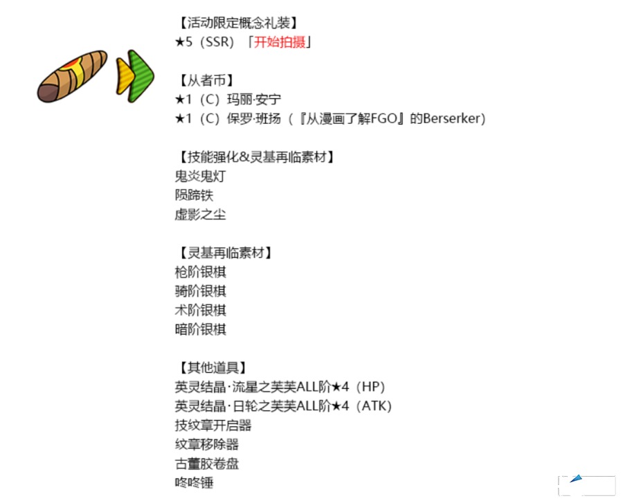此外,装备圣晶石召唤中被推荐召唤的限时概念礼装「★5(SSR)小孩子王国的冒险」「★4(SR)侏罗纪之梦」「★3(R)搜寻快乐」,活动道具「古董胶卷盘」「雪茄棒(伪)」「来福饭团」的掉落获得数将分别提升!