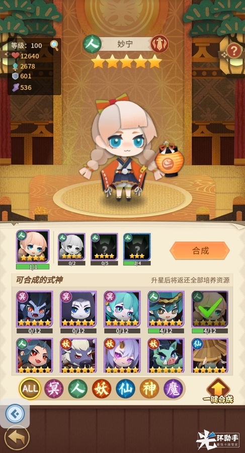 ①我们可以从主城处进入”升星神殿“,系统会自动提示当前可升星的式神,点击”合成“即可完成指定式神的升星操作。”升星神殿“的好处在于可以批量操作、一键升星。但是千万要注意的是,要确保升星材料足够,否则将会升星失败。